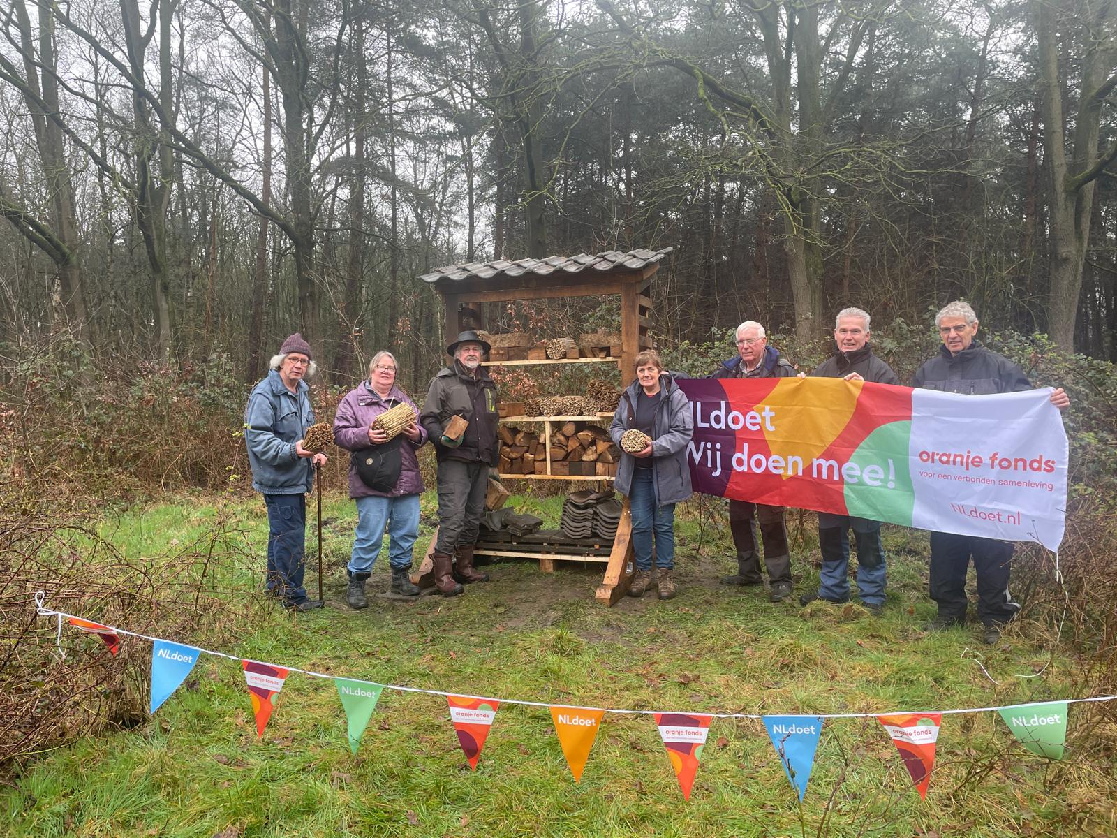 Een enthousiaste groep vrijwilligers heeft op de weides achter de kinderboerderij een begin gemaakt met een nieuw insectenhotel.