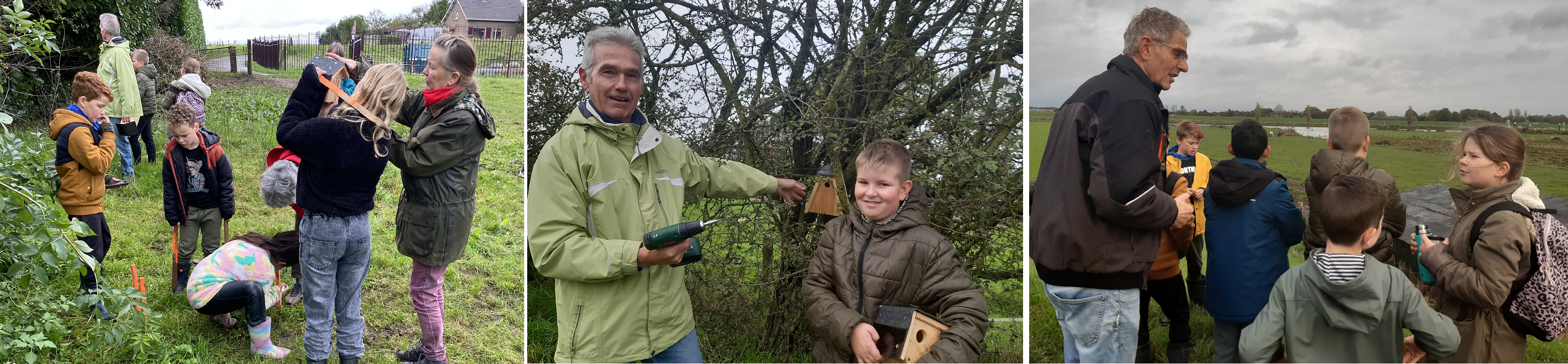 Deze ochtend hebben we nestkastjes opgehangen. Verder komen er grote insectenhotels. We hebben hiervoor geleerd over windrichtingen en leren werken met een kompas. Want de opening van de nestkastjes moet richting noordoost. Zo komt minder regen binnen en worden ze niet te warm. De insectenhotels moeten juist met de voorkant in de zon, dus richting het zuiden omdat de insecten van warmte houden. Voor de aannemer hebben we de piketpaaltjes vast geplaatst.