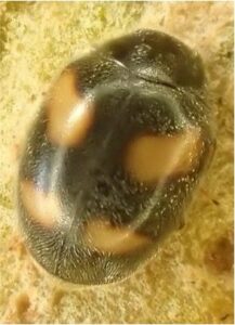 Karakteristiek zijn de zwarte vlekken die langs de naad tussen de dekschilden tot een gespiegelde muzieknoot versmolten zijn. De soort komt wijdverbreid voor in het grootste deel van Nederland en Vlaanderen en heeft daarbij een voorkeur voor vochtige terreinen en ruige vegetaties, maar zit ook in stedelijk gebied. De kever voedt zich met bladluizen en keverlarven en overwintert – vaak in groepen – achter schors van plataan en in gebouwen41. Zulke concentraties (afbeelding 4) troffen we onder andere aan in Halsteren (Eenlandsweg, 23 februari 2023, 25 exemplaren) en in Steenbergen (Wouwsestraat, 10 januari 2021, 10 stuks).