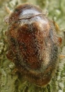 Op 13 februari 2023 troffen we onder de schors van een plataan aan de Oostdam/het Jacobspad in Steenbergen een moeraskapoentje aan. Het kevertje leeft in vochtige en koele gebieden, zoals moerassen en vochtige weilanden. Het wordt gevonden op kruidachtige planten, zoals riet en andere moerasplanten. Het overwintert in lage kruiden, bladstrooisel en mos. Ook hier geldt dat we het dier niet verzameld hebben en dat voor een betrouwbare determinatie microscopisch genitaal onderzoek van een mannelijk exemplaar nodig zou zijn geweest.