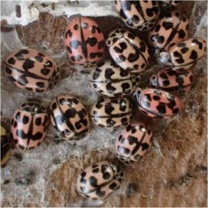 Het Aziatisch lieveheersbeestje, zowel het volwassen dier als de larve, verorbert grote hoeveelheden bladluizen. Dat geldt voor meer lieveheersbeestjes, maar deze soort is gemakkelijk in grote hoeveelheden te kweken en werd daarom vanaf 1996 in tuinbouw en fruitteelt ingezet tegen bladluizen en ander ‘ongedierte’. Zowel de wat oudere larven als de volwassen lieveheersbeestjes kunnen dagelijks tot 150 bladluizen consumeren. Bij deze soort treedt ei-, larf- en popkanibalisme op. Larven, die op zoek zijn naar bladluizen, verorberen onderweg de pakketjes met eieren en de larven van soortgenoten. De mortaliteit van de eieren is daarom meestal hoog28. Ontsnapte exemplaren weten zich echter ook in de vrije natuur goed te handhaven, ook daar leven bladluizen, terwijl natuurlijke vijanden aanvankelijk ontbraken. De eerste Nederlandse waarneming van het Aziatisch lieveheersbeestje in de vrije natuur wordt gedaan in 2002. In de daarop volgende jaren is het aantal waarnemingen eerst talrijker in het zuiden, midden en westen van het land. Daarna verovert deze invasieve exoot geheel Nederland. Tegenwoordig kun je hem bijna overal tegenkomen. Tijdens haar leven legt het vrouwtje van het Aziatisch lieveheersbeestje wel 3800 eieren in clusters van 20-50 stuks. Vaak zijn er niet voldoende bladluizen om zo’n nederzetting te voeden, zodat de larven zich gaan vergrijpen aan vers fruit, aan hun broers en zusjes en aan de larven van andere lieveheersbeestjes. Vooral het tweestippelig lieveheersbeestje lijkt daarvan het slachtoffer te zijn. Kortom wat ooit een perfect biologisch bestrijdingsmiddel leek, is als snel een uit de hand gelopen introductie van een invasieve soort geworden. Inmiddels is de inzet van het Aziatisch lieveheersbeestje als bestrijdingsmiddel niet meer toegestaan en worden andere soorten gebruikt, maar dat is te laat, de soort zit nu overal in en buiten Europa. Tegen de herfst verzamelen de dieren zich, vermoedelijk trekken zij elkaar aan met geurstoffen. Massaal gaan ze op zoek naar een geschikte plek om te overwinteren. Via spleten en kieren, of gewoon omdat iemand wel eens een deur open zet, weten ze allerlei niet verwarmde ruimten te vinden, als souterrains en zolders. Een succesvolle overwinteringsstrategie, een grote hoeveelheid nakomelingen en het ontbreken van natuurlijke vijanden, zijn de succesformule voor een bijna explosieve uitbreiding van het Aziatisch lieveheersbeestje29. Nu, vijftien jaar later, lijkt er een einde te komen aan dat succes. Zes jaar na de opkomst van het Aziatisch lieveheersbeestje wordt voor het eerst een exemplaar gevonden met een schimmelziekte, waarmee de andere soorten lieveheersbeestjespopulaties al heel lang geconfronteerd worden. De parasitaire schimmel komt sindsdien steeds vaker voor en gaat steeds frequenter ook het Aziatisch lieveheersbeestje parasiteren30. Uiteindelijk lijkt hier een evenwicht te gaan ontstaan tussen het Aziatisch en de inheemse lieveheersbeestjes. Het Aziatisch lieveheersbeestje vertoont een grote variatie in kleur en tekening van de dekschilden. Zo zijn onder de schors van platanen in Bergen op Zoom de volgende variëteiten aangetroffen: – f. succinea (veelstippelig op rode of gele achtergrond); – f. spectabilis (viervlekkige vorm) – f. conspicua (twee vlekken). We komen deze soort weinig als overwinteraar tegen op platanen (meestal de variëteit succinea), uitgezonderd de winter 2023/’24, toen we de soort op zeventien verschillende plaatsen als overwinteraar konden registreren.