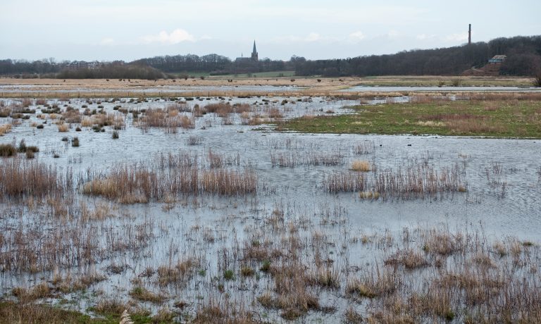 Zicht vanuit natte natuurparel Noordpolder op de steilrand en de kerk van Hoogerheide (foto: Fred Severin)