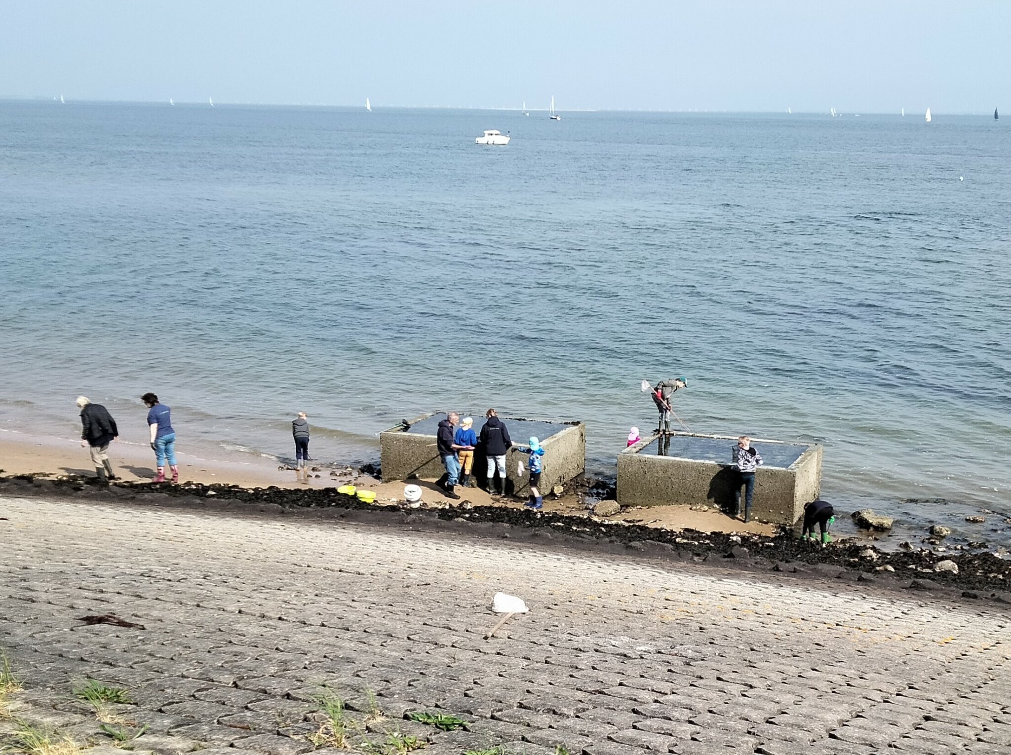 We gaan naar Wemeldinge om de inhoud van de getijdenbakken te bekijken. Bakken? Jazeker, dit zijn grote betonnen bakken die bij hoogwater vollopen met water en de daarbij behorende diertjes en met laag water kan je er naar toe lopen. Het water en de diertjes blijven erin en zijn heel goed zichtbaar. Wat een avontuur, we zien heel veel zeedieren, zoals een zeester, een zee-egel, een kwal, garnalen en een enorme variatie aan grote en kleine krabben. Het kleinste diertje is het harige porseleinkrabbetje, hij is zo groot als een vingernagel. Ook zien we verschillende soorten wieren.