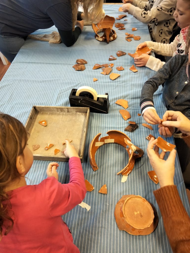 Stichting In den Scherminckel, een organisatie van amateurarcheologen, heeft hier een depot en een tentoonstelling van alle resultaten van hun opgravingen. We krijgen een rondleiding door het depot (wat is hier veeeeeel te zien!) en zien wat er gevonden is o.a. bij het kasteel van Wouw. En we ontmoeten De Grote Man van Bergen op Zoom. Uiteraard mogen we ook zelf aan de slag om van een paar scherven een kommetje te maken.