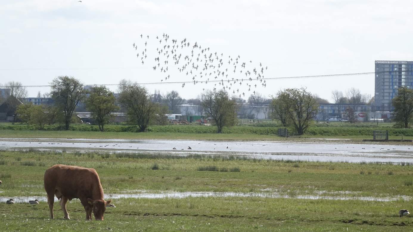 Foto’s: Jan Faber. Boven: vlucht van tientallen kemphanen bij de bezoekboerderij van Groninger Landschap in de Koningslaagte, 26 april ’21. Midden: diverse kemphanen in eén beeld in het Reitdiepdal bij Hekkum, 27 april ’21. Onder: groep rustende kemphanen in de Koningslaagte, 20 april ’21.