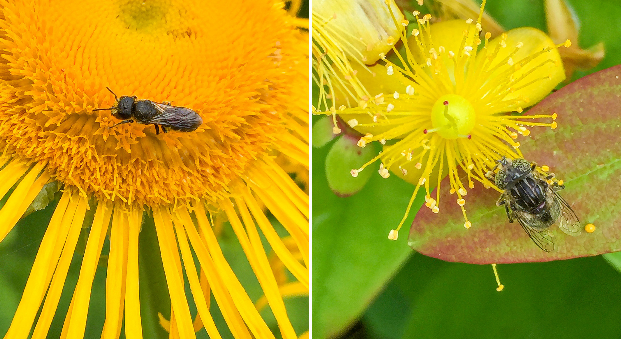 Ik zie het stuifmeel aan de onderkant van het achterlijf. De Klokjesbij is een zogenaamde buikschuiver, ze gaat met de buik over het stuifmeel heen, daar verzamelt ze het tussen de haartjes en brengt het vervolgens naar het nest. Een andere buikschuiver is de Tronkenbij (links op de foto), die slaat haar achterlijf fanatiek heen en weer. Het lijkt me hard werken om de hele dag zo bezig te zijn.
