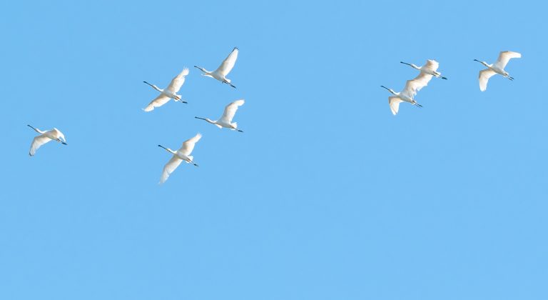 Een andere dag fietsen we door het uitgestrekte gebied. Vliegdennen, hele oude jeneverbesstruiken, een spoor van ijstijd keien, lijken op afstand schapen. We passeren het Holtveen, en nog meer vennetjes. Dan in de verte, witte vliegende vlekken. Mijn geluksdag: één van mijn lievelingsvogels, de lepelaar. Zijn ze aan het proefvliegen? Ik tel veertien witte schoonheden, die fotogeniek in de zon schitteren. Ze tonen voor onze ogen een prachtige vliegshow. Simultaan, in formatie en kris kras door elkaar. Na veertien minuten landen ze één voor één ergens achter een eilandje. Even later lijkt het alsof er niets bijzonders is gebeurd. Wij branden dit speelse beeld in ons geheugen.