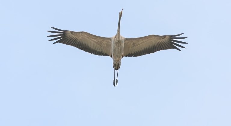 Met ingehouden adem, zo weinig mogelijk geluid makend. Dus, man en hond zijn bij de fietsen gebleven. De verrekijker in de aanslag en ja zeg, daar vliegt iets. Beter kijkend zijn het er drie. Ze zijn groot en voornamelijk wit. Door de kijker zie ik dat het geen ooievaars of zilverreigers of lepelaars zijn. Die laatste zouden ook al lang weggetrokken moeten zijn, weet ik van de Westerplas op Schiermonnikoog. Waar ze van het ene dagdeel op het andere weg kunnen zijn met zijn honderden. Nee zeg, ze hebben donkere koppen en een soort afhangende korte staart en behoorlijk grote zwarte uiteinden van de vleugels. Toen ging mijn hart een beetje op hol. Het zou toch niet waar zijn … kraanvogels? Heb ik nog nooit eerder in levende lijve gezien. Heb de hele vlucht van zeker drie ronden boven het kennelijk aanwezige water achter het bosje berken goed kunnen bekijken door mijn kijker. Ondertussen zijn ze schel naar elkaar aan het roepen met rauwe trompettergeluiden. Na dit avontuurtje snel terug naar de fietsen en met grote ogen en opgewonden stem mijn waarnemingen verteld.