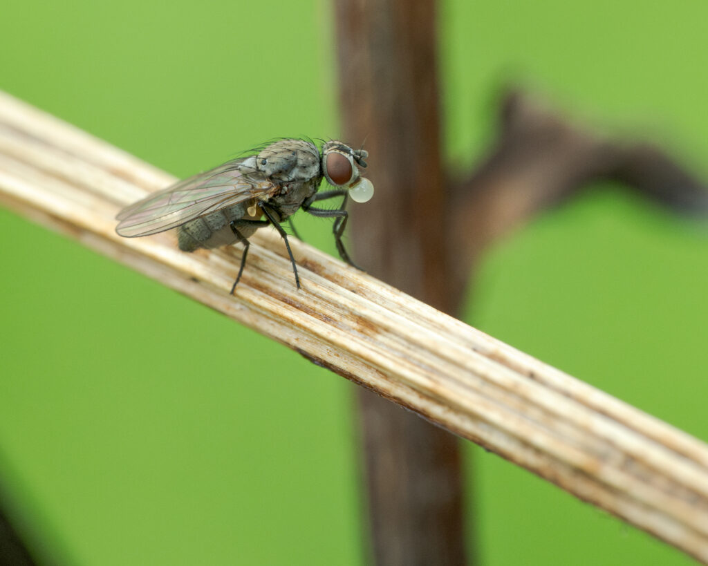 Niet alle vliegensoorten gebruiken deze truc, het zijn vooral de kleinere vliegensoorten. De vlieg uit de bloemvliegenfamilie op de foto kan het in ieder geval wel.