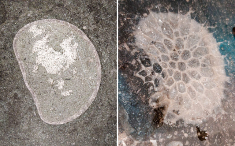 Neem een sponsje of doekje en een plantenspuit of flesje water mee: daarmee kun je fossielen beter zichtbaar maken