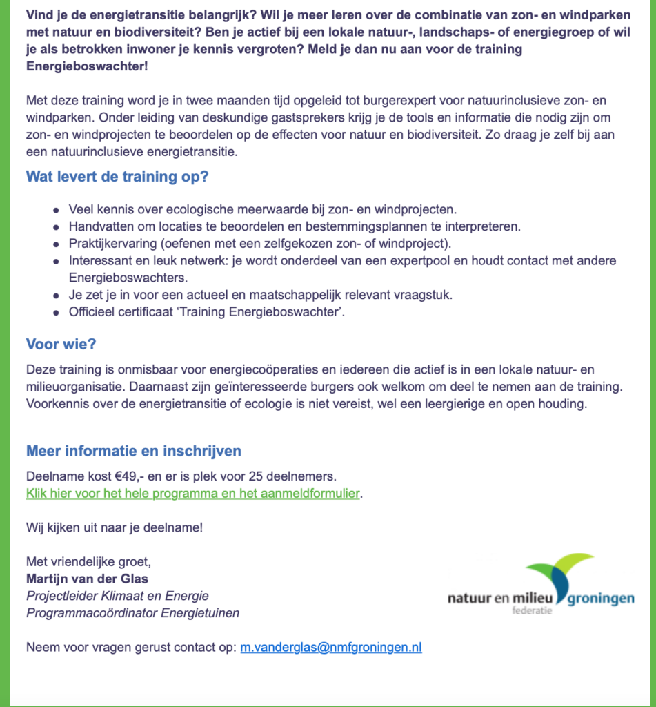 Klik op de link hieronder als je meer wilt weten over de training om in twee maanden ‘burgerexpert’ te worden op het gebied van natuurinclusieve energietransitie! Je kunt je daar ook opgeven voor de training.