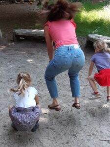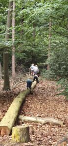 Om de eekhoorn wat meer in de picture te krijgen hebben we de boomtelefoon en de balansopdracht. Bij de boomtelefoon moet 1 kind zijn hoofd in de boomtelefoon houden en aandachtig luisteren hoe veel keer een ander kind op de boom tikt. Er wordt lustig op los getrommeld. Niet te tellen! Daarna uitleg door ons: Een eekhoorn zit soms heel stil aan de boom om te luisteren of er geen vijand in de boom zit. Bij de balansopdracht mag je over een liggende boomstam lopen, of kruipen als een eekhoorn met handen en voeten of huppelen. Dit doen we met de hele klas aan het eind als afsluiting. Mooi is te zien hoe verschillend ieder kind dit doet. Heel voorzichtig armen wijd houdend balancerend erover heen of rennend, of kruipend dus. Soms is er nog een beetje hulp nodig van een vrijwilliger. Vooral bij de extra hindernis bij het onder een tak doorgaand, al bukkend.