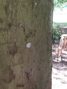Bij de spechtenboom goed luisteren of je een specht hoort timmeren met zin snavel. Bij deze kastanjeboom ook alle spechtengaten tellen en dat zijn er heel veel. 10.. 11. ..veel! hoor ik een meisje zeggen.