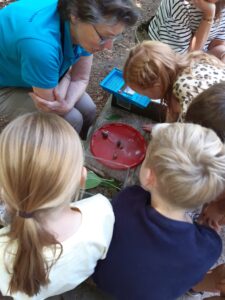 Ook dit keer hadden we kikkervisjes van de groene kikker en van de pad. Ze konden vreselijk goed kikkersprongen maken en als een trage pad lopen. Kwaken en piepend hupsten ze rond. Bij de vlinderbak waren al wat stippelmotjes uit de poppen gekropen. Op zoek naar zoetig drinken. Het blijkt dat deze groep de cyclus van de kikker en de vlinder al goed kent