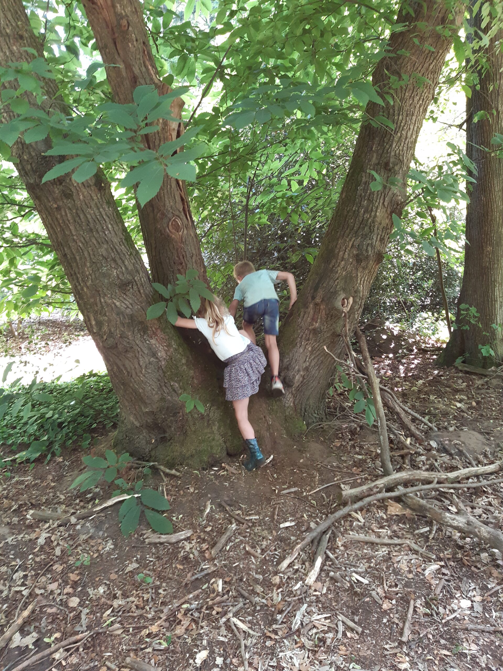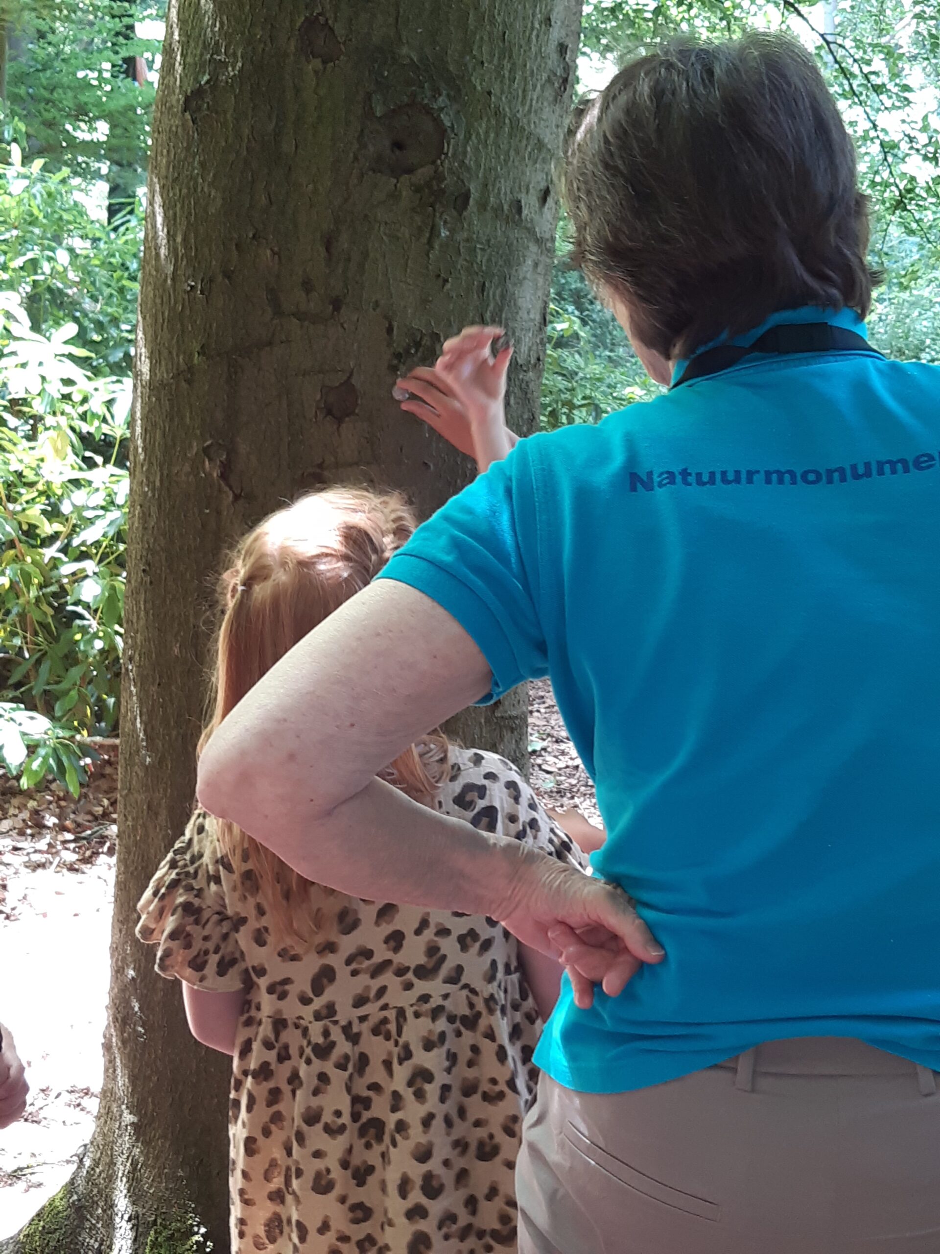 Bij de spechtenboom goed luisteren of je een specht hoort timmeren met zin snavel. Bij deze kastanjeboom ook alle spechtengaten tellen en dat zijn er heel veel. 10.. 11. ..veel! hoor ik een meisje zeggen.
