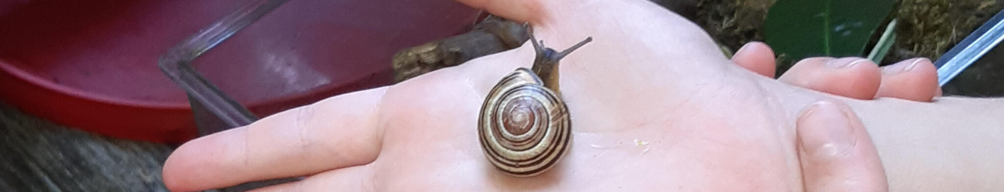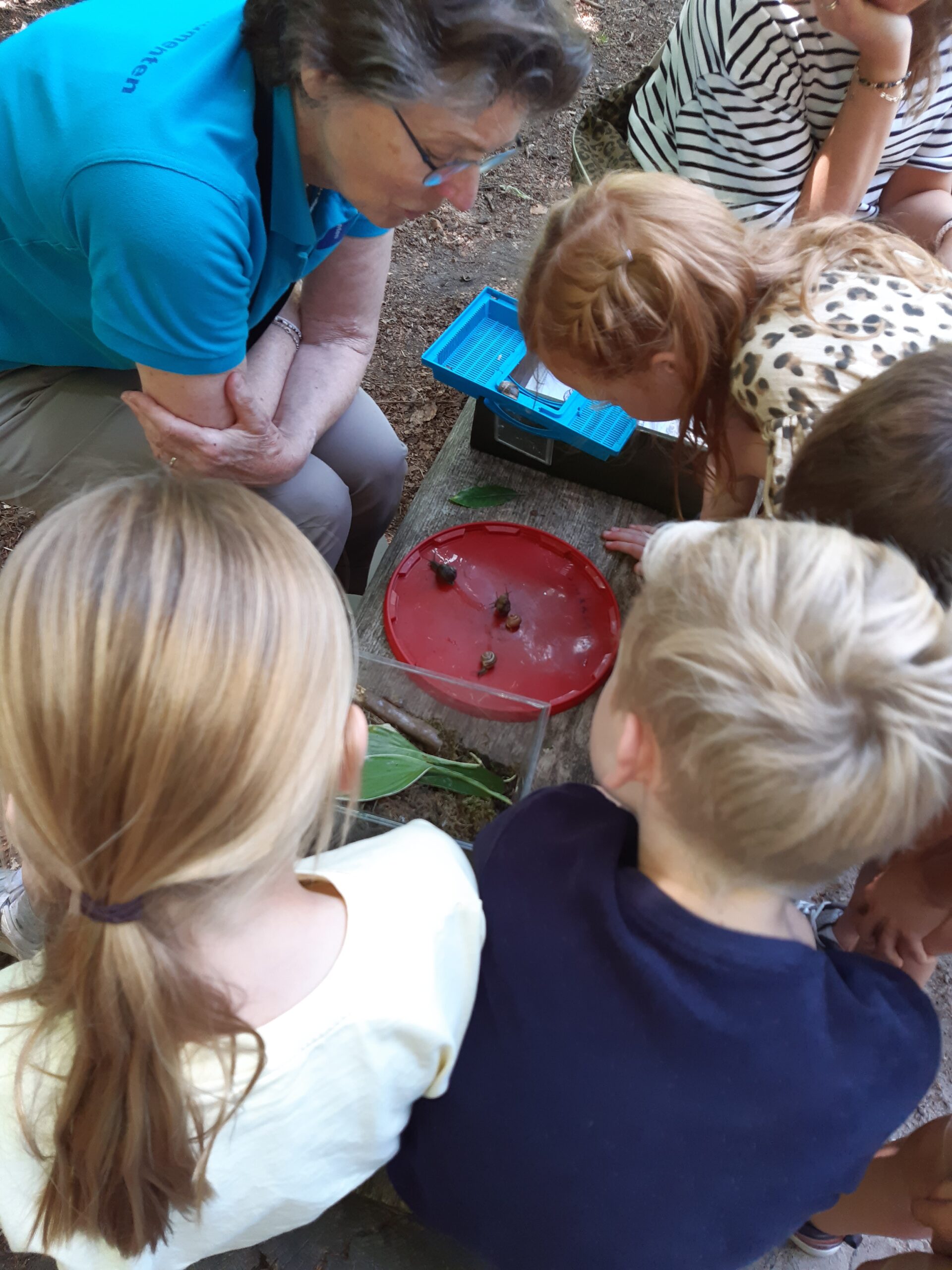 Bij de kateaker was er een slakkenbak. Eerst rondom zoeken naar slakken. Ja hoor hoog aan een boom zitten slakken, een slak met streepkleuren en een grote bruine slak. Door de slijmsporen op de schors had een jonge spoorzoeker de slakken gevonden. Onze vrijwilligers zetten bij de kinderen ,die dat willen dan een slak op de hand. Dan kun je de slak goed voelen en bekijken. Ogen op steeltjes en voelsprieten. Altijd je huis bij je op de rug! Een slak heeft ook een mond met tanden ja! Als de slak veel harde appels eet en zijn tanden slijten, dan krijgt hij gewoon een nieuwe rij tanden! Dat is nog eens mooi! Twee slakken zaten aan elkaar gekleefd. O, dat zijn een mannetje en een vrouwtje, zegt een jongen. Nee hoor ! Slakken zijn allebeide meisje en jongen tegelijk. Ze kunnen met elkaar ,allebeide eitjes leggen in het zand en die zien er uit als witte kraaltjes.