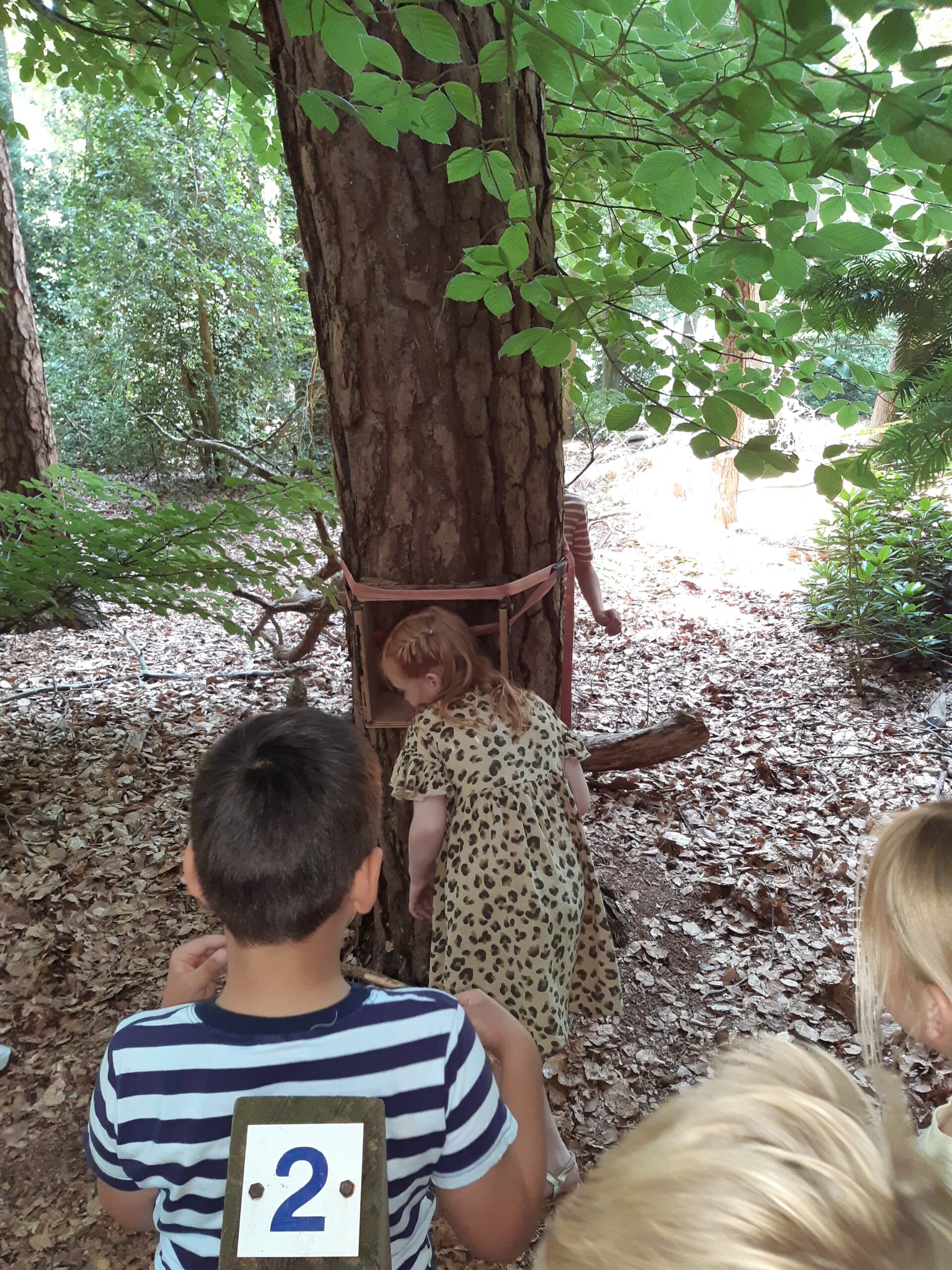 Om de eekhoorn wat meer in de picture te krijgen hebben we de boomtelefoon en de balansopdracht. Bij de boomtelefoon moet 1 kind zijn hoofd in de boomtelefoon houden en aandachtig luisteren hoe veel keer een ander kind op de boom tikt. Er wordt lustig op los getrommeld. Niet te tellen! Daarna uitleg door ons: Een eekhoorn zit soms heel stil aan de boom om te luisteren of er geen vijand in de boom zit. Bij de balansopdracht mag je over een liggende boomstam lopen, of kruipen als een eekhoorn met handen en voeten of huppelen. Dit doen we met de hele klas aan het eind als afsluiting. Mooi is te zien hoe verschillend ieder kind dit doet. Heel voorzichtig armen wijd houdend balancerend erover heen of rennend, of kruipend dus. Soms is er nog een beetje hulp nodig van een vrijwilliger. Vooral bij de extra hindernis bij het onder een tak doorgaand, al bukkend.