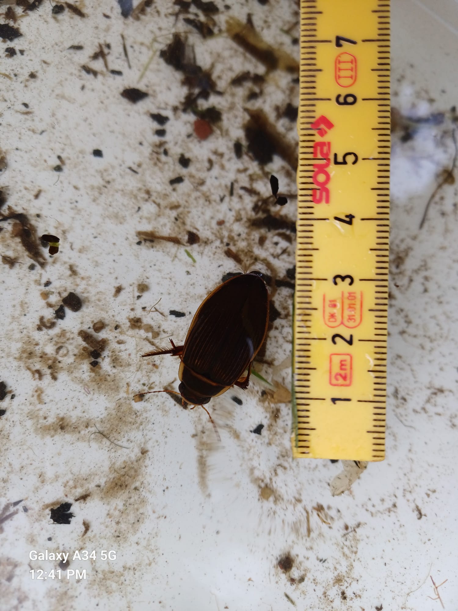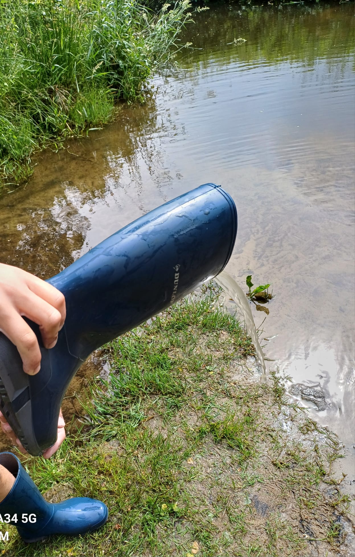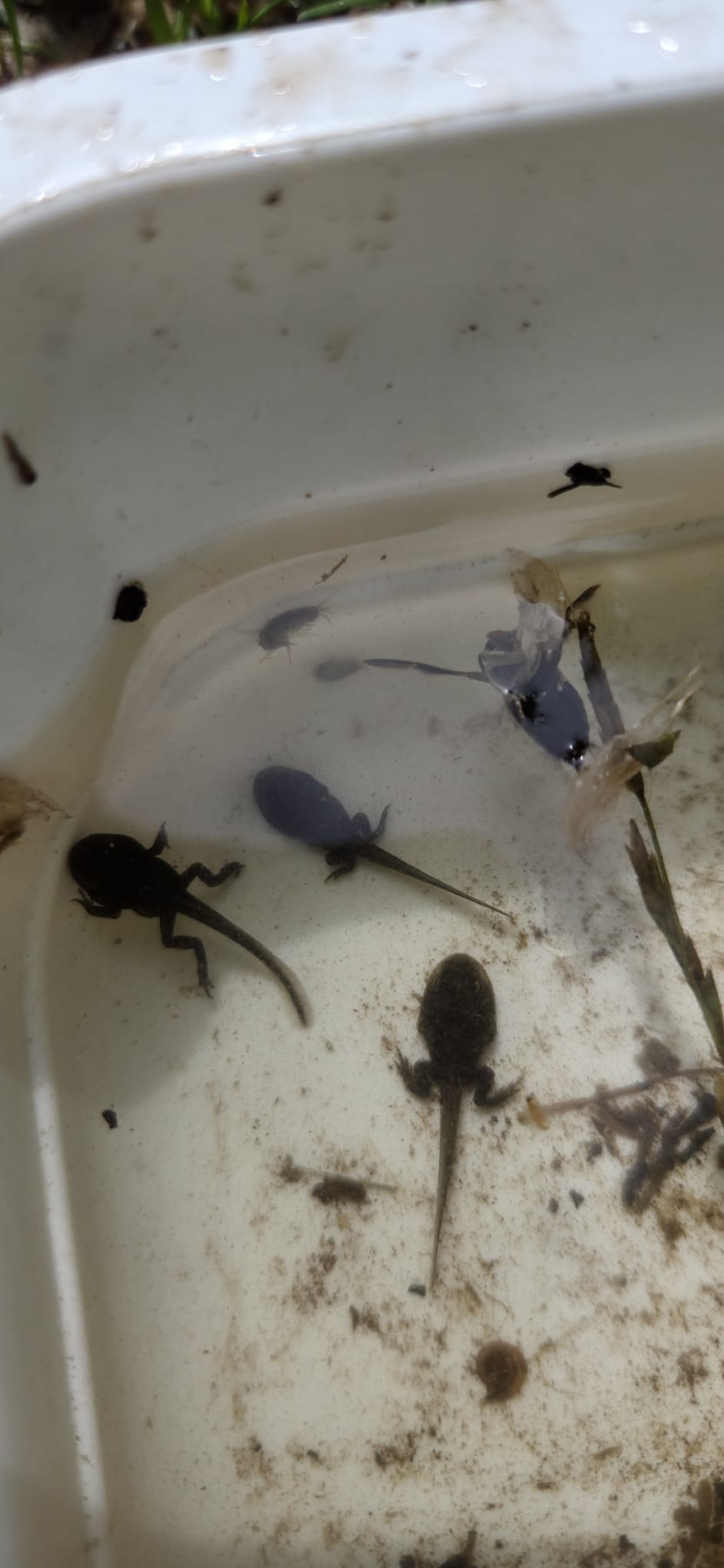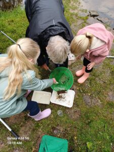 Tussen de planten ging Thimon tussen de planten op zoek naar kikkervisjes. Ja daar zaten ze in het ondiepe water. De kikkervisjes in verschillende stadia, met staart en a sommige met achter en /of voorpootjes. De laatste zullen al gauw echte kikkertjes zijn die ook graag even uitrusten op een steen of plant en dan even kunnen ademhalen. De wat grotere kinderen wisten wel dat het kikkervisje dan geen visje meer is. De ouders waren ook enthousiast en deden volop mee. Door een papa werd een geelgrande waterkever gevangen! We hebben echter geen larve van deze kever gevangen. Dat is een echte rover en heet Watertijger. We vingen nog bootsmannetjes, kevers die roeipoten hebben en luchtbelletjes tussen hun buikharen hebben .Die bootsmannetjes hebben ook een lichte kleur bij de buik, grijsgroen. Dat hebben ze voor hun veiligheid. Het werkt zo: beestjes die onder het bootsmannetje zwemmen en hem op willen eten zien iets grijzigs als ze omhoog kijken naar het beestje en het wateroppervlak. Het lukt de rover dan niet om het bootsmannetje goed te zien en te pakken. We vingen nog gewone libellelarven en larven van de elzegaasvlieg. Poelslakken, die moeten ook steeds een hap lucht halen en posthoornslakken kunnen langer onder water blijven, die hebben ook nog kieuwen.