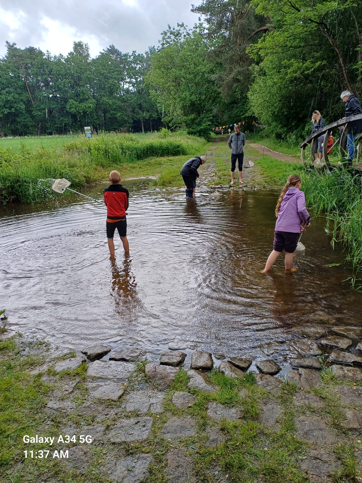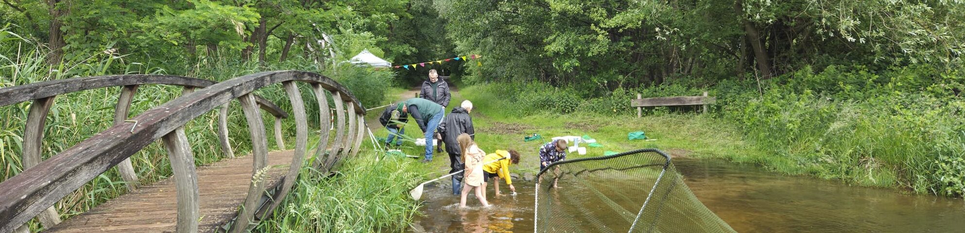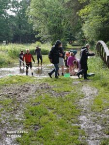 Er kwamen gelukkig meer kinderen en die trokken meteen hun schoenen uit en liepen blootvoets in de voorde al scheppend rond. Sommige hielden hun aarzen aan. Dat je dan soms iets te ver in het water bent, merk je als je laarzen vollopen. Maar ach het water is lauwwarm, het deert ze niet. Nadat er meer kinderen waren begonnen werden er wel libellelarven van de libellejuffer gevangen . Deze libelle houdt zijn vleugels dubbel gevouwen op de rug als hij stilzit. Een klein jongetje ging aan de hand ook voorzichtig lopend over de stenen het water in met een loeppotje. Net als de grote kinderen leegde hij zijn potje ook in de bak.” Wat heb je gevangen” zei zijn papa. Papa zag niks. Jammer want het jochie had toch echt heel veel watervlooien gevangen. Maar ja die zien papa’s niet hé! Heel trots ving zijn broer een visje. Het was een stekelbaarsje, de stekels waren nog niet goed te zien. Even verteld aan hem dat stekelbaarsvaders heel goed voor hun vissenkindjes zorgen, nadat mama stekelbaars de eitjes in een plantenholletje heeft gelegd. Wel raar dat veel dieren hun eitjes in het water doen en dan weer verder vliegen of lopen en hun kinderen aan hun lot over laten. Ze moeten dan zelf eten zoeken, zelf oppassen dat een ander beestje je niet opeet.