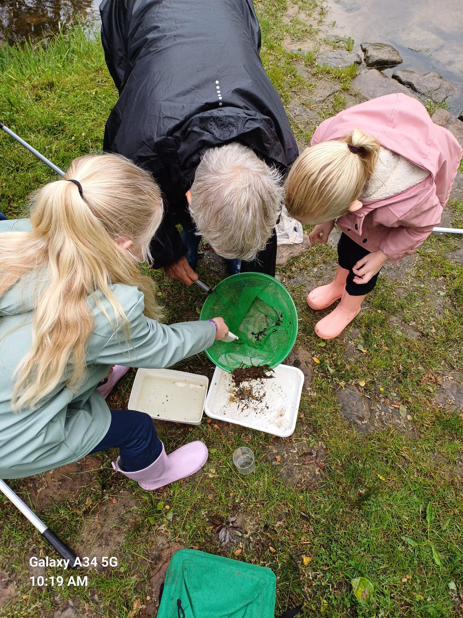 Ben was vandaag zo vroeg uit de veren dat we op tijd naar het Waterpark gingen om de tent op te zetten. Hierdoor liepen we Cornelia mis die wel gewoon op tijd kwam! Gelukkig vond Cornelia ons toch bij het bruggetje. Wel na enig dubben: is het vandaag nou slootjesdag of niet!! Al gauw zaten we met een kop koffie te kletsen. Toen begon het wachten of er kinderen zouden komen. Het regende en miezerde! Maar gelukkig het was net 10.00 uur en daar kwamen de eerste kinderen al aan.