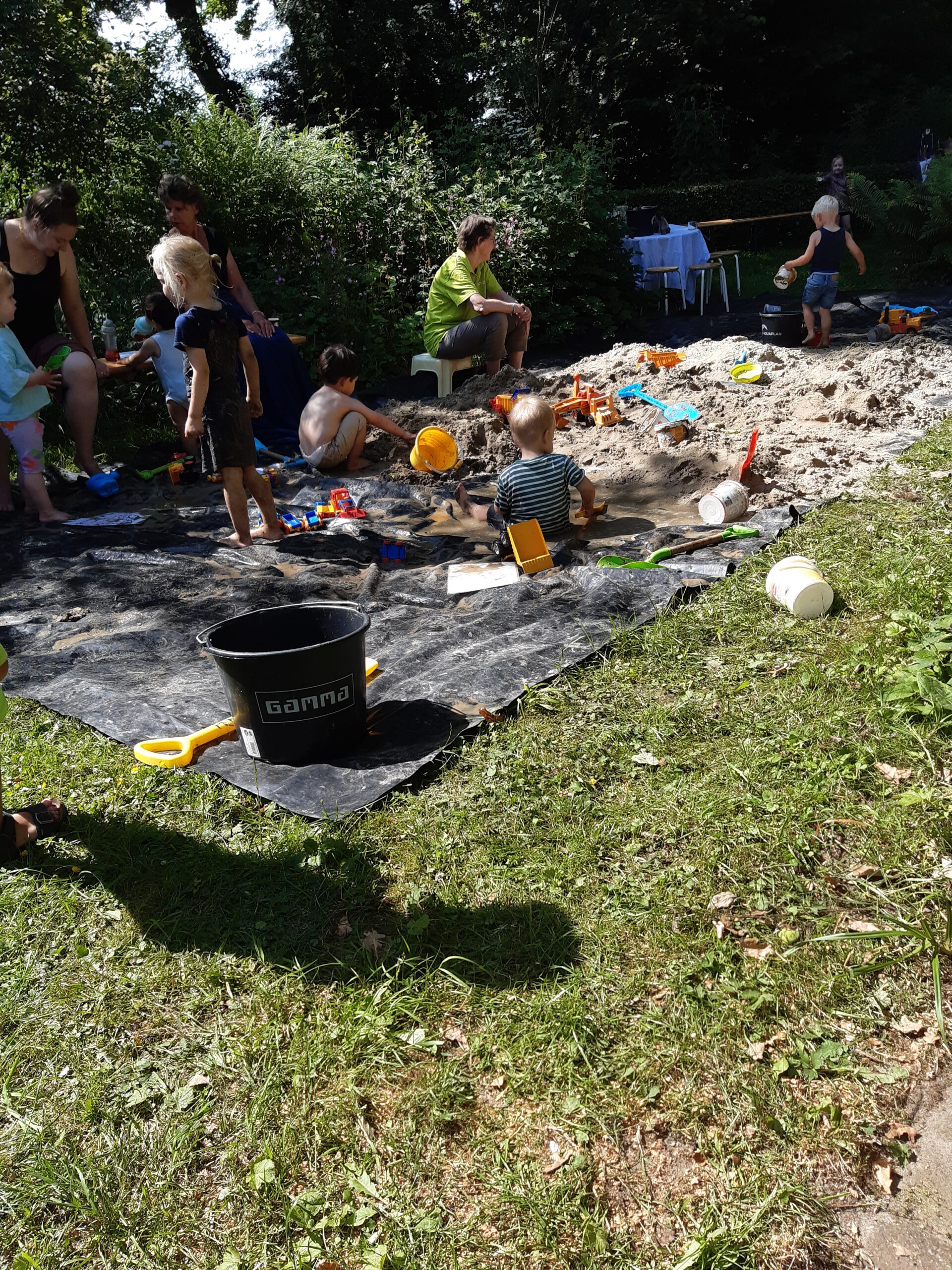 Even aarzelden sommige kindjes nog, maar zodra ze de modderige varkentjes zagen, gingen alle remmen los en doken ze enthousiast mee in de pret. Het werd een heerlijke ochtend vol speelplezier met scheppen, emmertjes en vrachtwagens. De emmers moesten regelmatig worden bijgevuld met de tuinslang, wat de kinderen geweldig vonden – vooral als ze de sproeikop zelf mochten vasthouden.