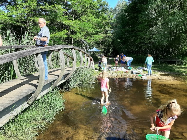 Het schepnetvissen deden we voor, daarna ging men aan de slag. Met het schepnet vanaf de kant bij de voorde en aan de beekwal probeerden ze waterbeestjes in het net te krijgen. Door het zonnige weer gingen al gauw enkele kinderen en zelfs ouders het water in. Zodra er wat gevangen was werd er op de zoekkaart gekeken wat voor beestje het was. Dit jaar hadden we ook scharrelkidswaterbeestjes- kaarten erbij, handig om iets op te zoeken.