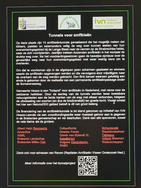 In het voorjaar van 2023 is een crowdfundingsactie gestart om een permanente verbinding aan te brengen tussen de beide natuurgebieden. Ravon heeft berekend dat er 8 à 10 tunnels nodig zijn om het hele traject af te dekken. De inzamelingsactie onder de lokale bevolking en het bedrijfsleven heeft tot nu +/- 3 tunnels opgeleverd, de gemeente Heeze-Leende en de provincie Noord-Brabant financieren minimaal 4 tunnel
