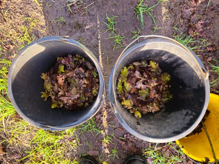 De jaarlijkse trek van amfibieën over de Somerenseweg in Heeze is door het relatief warme weer nu goed op gang gekomen. Waar het de afgelopen weken vaak ’s nachts te koud was, zijn de omstandigheden nu bijzonder gunstig: geen nachtvorst en een beetje regen in de ochtend. Dat heeft ertoe geleid dat afgelopen woensdag 26 februari op één dag 2103 beestjes (waaronder 1567 heikikkers!) in emmers naar de overkant van de weg werd gebracht door een groot aantal in allerijl opgetrommelde vrijwilligers. Daarmee werd het oude dagrecord van 17 februari 2022 van 1291 ruimschoots verbroken. Tot nu zitten we op ruim 4300 amfibieën, terwijl het jaargemiddelde rond 3400 ligt. En dat terwijl het pas februari is! Het lijkt dus een topjaar te worden, te vergelijken met de uitschieter van 6586 exemplaren in 2022.