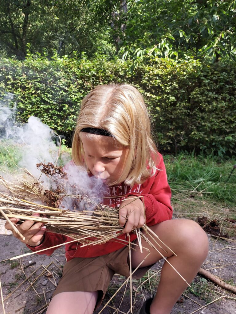 “Het was druk bij de schuur van de boswachter vanmorgen, en nog een beetje fris, maar daar kwam al snel verandering in. We gingen namelijk leren vuur maken, en dan niet zoals wij het gewend zijn met een aansteker, maar op de ‘bushcraft-manier”: met vuursteen, staal en een goede voorbereiding aan brandbaar materiaal.