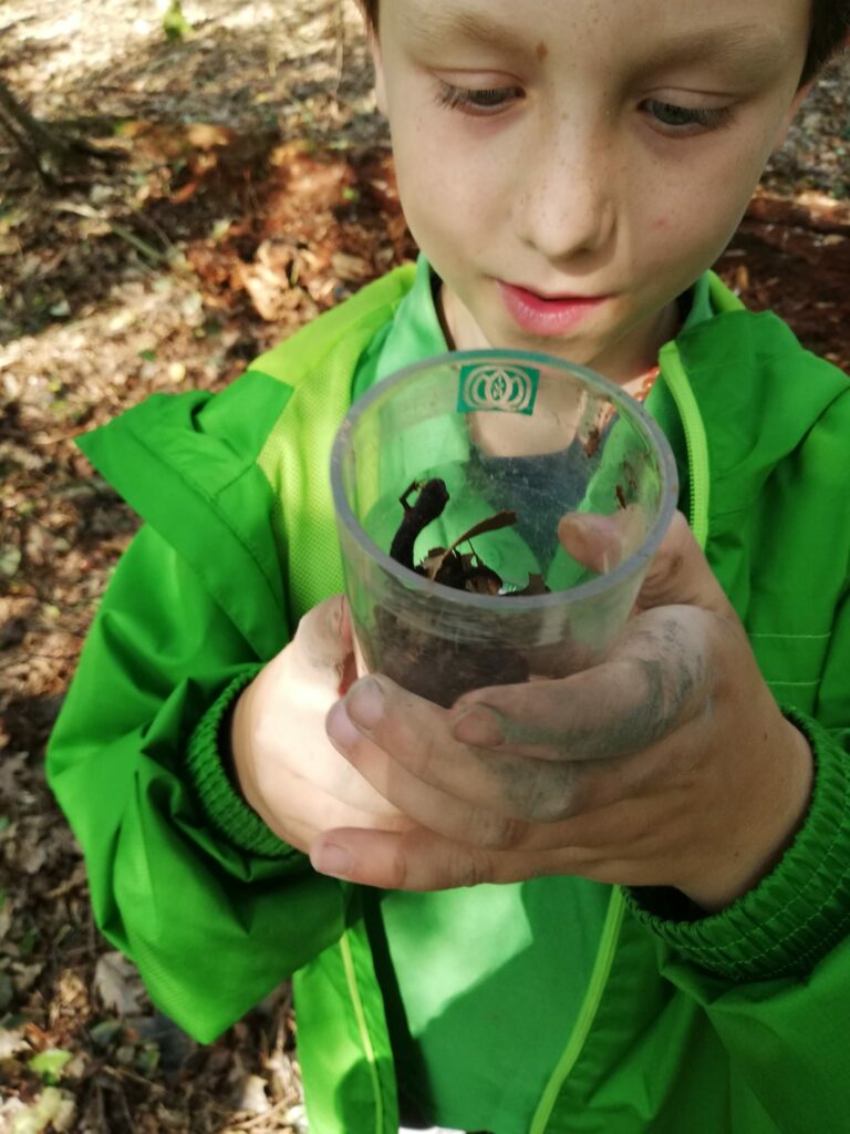 Naast kijken en voelen van de bodem hebben we natuurlijk ook gekeken welke beestjes er in de bodem en vlak op de grond leven. Zo hebben de kinderen heel veel salamanders in rust gevonden onder de bladeren, maar ook wormen, pissebedden, schimmels op bomen. Ook hebben ze krekels en wespspin met nest gespot en zelfs nog een bot gevonden, waarschijnlijk van een ree..