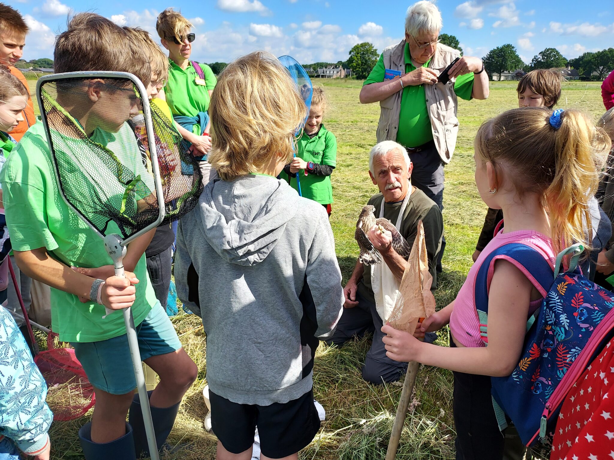 Wat een ochtend! Boer Gerard had een verassing voor ons toen we aankwamen. Iedereen stond klaar met schepnetten en emmers, klaar voor een ochtend met waterbeestjes, maar we mochten eerst het weiland door op zoek naar het nest van een torenvalk! Het (enige) jong werd vandaag geringd, en wij mochten daarbij zijn! Nou, dát maak je niet elke dag mee, en de kinderen waren dan ook enorm onder de indruk.