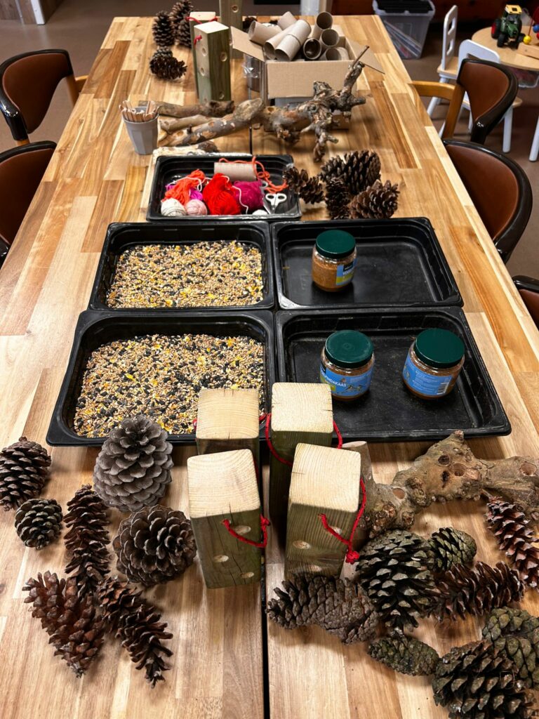Na een korte uitleg van Geert Engels over de vogels die we in onze tuinen kunnen waarnemen volgde een ontbijt, verzorgd door medewerkers van het dorpshuis. Daarna werd er volop geknutseld met dennenappels, takken, houtblokjes, vet, pindakaas en zaden. En dat allemaal voor de vogels! Iedereen ging naar huis met een vogeltelplaat om zelf te kunnen tellen.