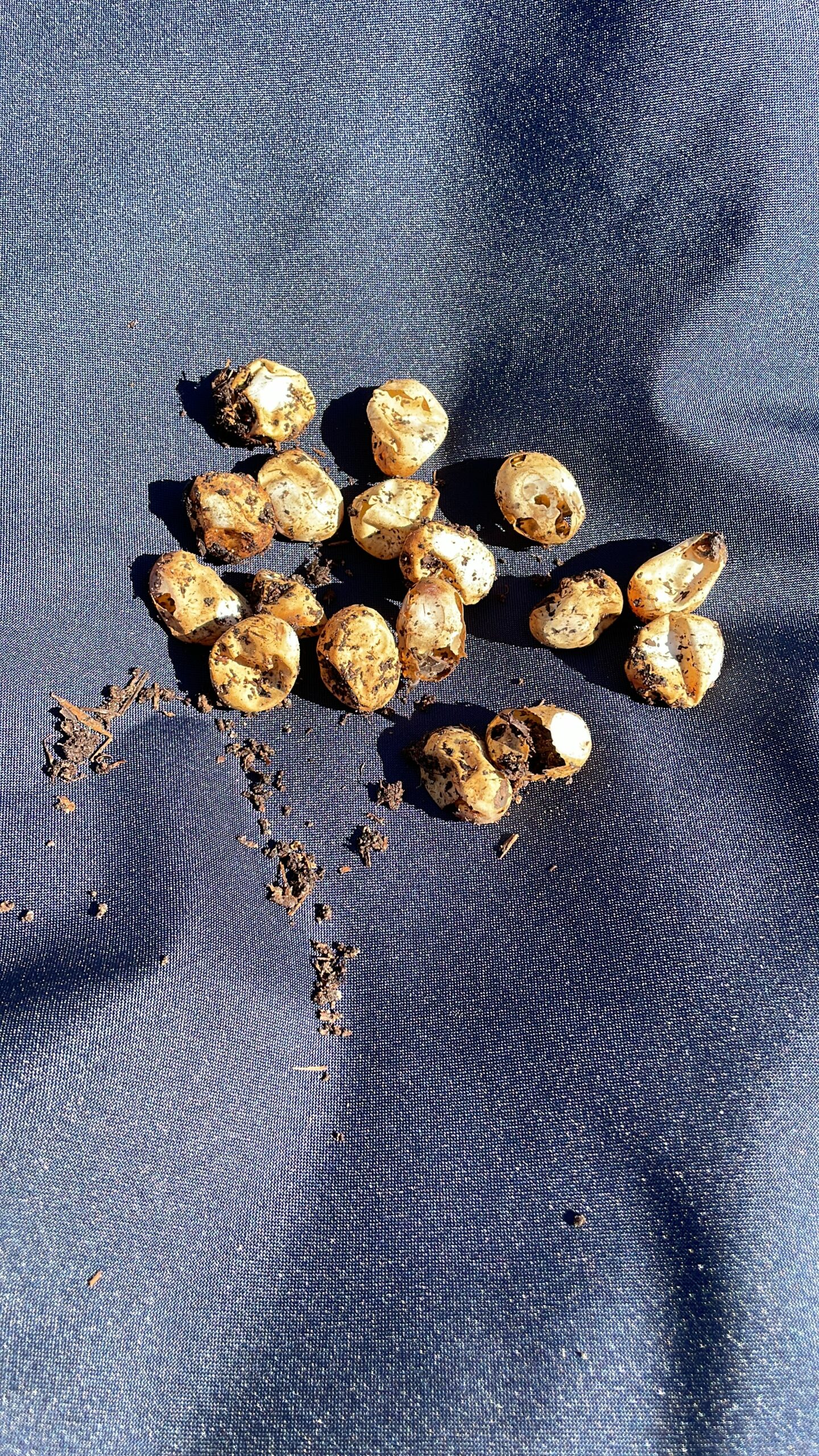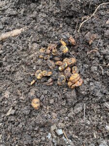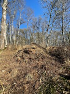 Vorig jaar zijn de hopen omgezet, maar zijn er geen eieren aangetroffen. Dit jaar hebben we op 27 maart helemaal onderin de eerste broeihoop 17 uitgekomen eieren aangetroffen. Daarna is de hele hoop opnieuw opgebouwd en zelfs een flink stuk uitgebreid.