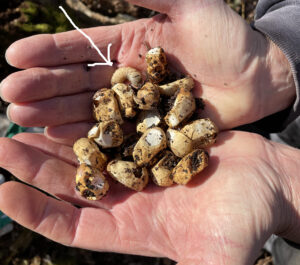 Wauw, bij het omzetten van de tweede broeihoop vandaag (10 april) troffen we alweer eieren aan. En deze keer zelfs 28 stuks.
