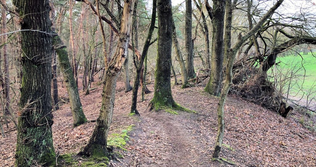 Het laatste deel van de wandeling gaat langs een kronkelpaadje over met eiken begroeide stuifduinen.