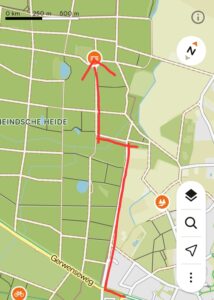 de Wiebiegenweg afrijden, auto parkeren aan bosrand, verder te voet, einde links, rechts. |