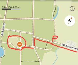 de Wiebiegenweg afrijden, auto parkeren aan bosrand, verder te voet, einde links, rechts. |
