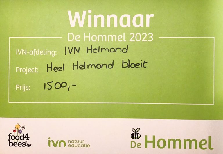 Goed nieuws voor alle insecten in Helmond, Nuenen en Oirschot. De drie IVN-afdelingen in deze gemeenten ontvingen vorige week de Hommel. Een cheque van € 1500,- uitgereikt door IVN Brabant en Food4Bees. Hiermee gaan de drie IVN afdelingen aan de slag met mooie projecten die de bestuivers in Van Gogh Nationaal Park, waaronder al het groen in Helmond, gaan helpen.