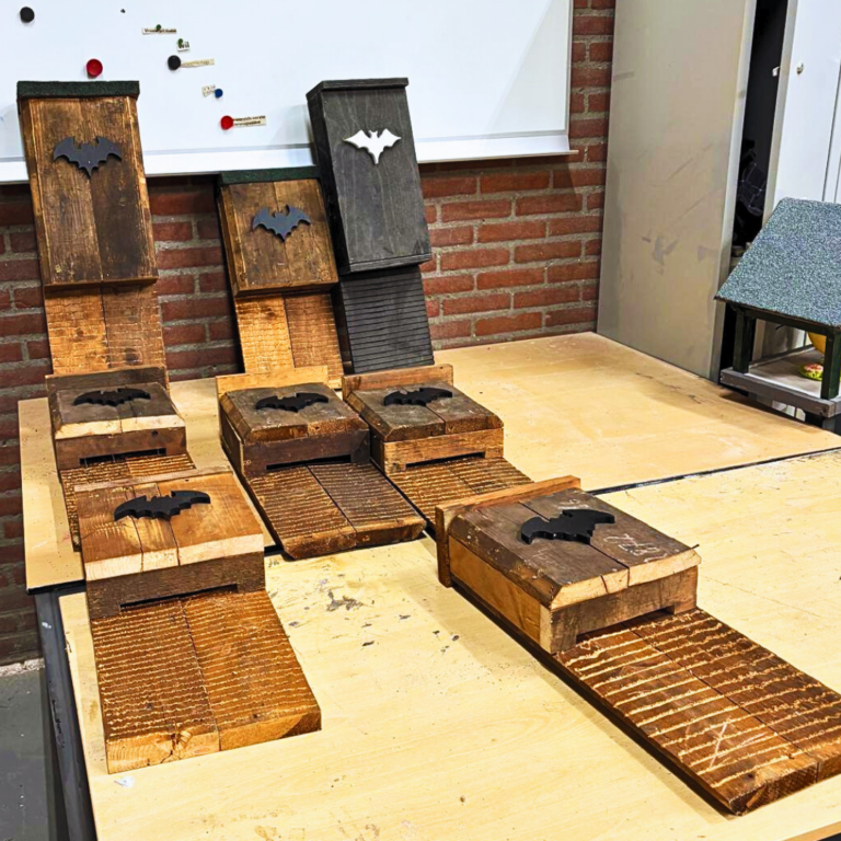 Deze prachtige vleermuiskasten zijn handgemaakt door cliënten van Oro. Hierbij is er gebruikt gemaakt van geselecteerde, gerecyclede materialen. Het hout is bijvoorbeeld zoveel mogelijk afkomstig van afvalhout, en de kastjes zijn voorzien van dakbedekking dat een tweede kans heeft gekregen. Extra duurzaam, dus.