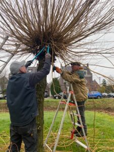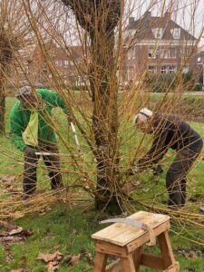Op 16 en 17 februari heeft de Werkgroep Natuurbeheer haar jaarlijkse knotklus afgewerkt; deze keer op Brandevoort, omgeving Roselmanserf / Stepekolk. Op beide dagen stonden ruim 15 leden en andere vrijwilligers klaar om de strijd weer aan te gaan. Ondanks de gestage regen op vrijdagmiddag slaagden de mannen en vrouwen (!) er weer in om een kleine 20 oudere wilgen bij de rotonde Stepekolk te ontdoen van hun pruiken, maar het was een pittige klus. Om af en toe te kunnen schuilen was vooraf de IVN-tent opgezet, maar eenmaal nat deerde het niemand dat de regen maar bleef komen. We zullen doorgaan! Dat deden ze ook, mede door een vijftal aanwezige leden van Buurttuin Brandevoort die graag een flinke partij staken en wilgentenen wilden hebben voor een nieuw leven bij De Voorstee, hun nieuwe onderkomen aan de Medevoort. Hoe anders ging het op zaterdagochtend! Geen regen, geen mineurstemming, maar goeie zin en positieve energie! En zo ging de ploeg de dubbele rij bronzen knotwilgen aanpakken in de laagte bij het Roselmanserf en zag de hele omgeving rond 12.30 uur weer keurig geordend uit, alsof de kapper was langs gekomen. Een mooie aanblik voor mensen die houden van orde en netheid, tegenwoordig een verwerpelijk streven maar dat accepteren kost menigeen nog steeds veel moeite.