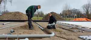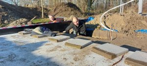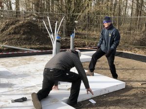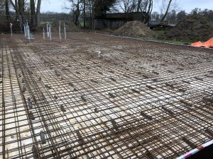 Midden december is de bekisting geplaatst in twee dagen. 3 januari 2023 de bodemisolatie. Installatiebedrijf Zwienenberg had kerstreces. Dinsdag 10 december dan aan de slag met de installatie van de leidingen onder de fundering. Helaas woensdag regen, regen… en daarna vorst. Voor de verlijming van de buizen moet het warmer dan 5 graden C. zijn. Maandag 6 en 7 februari kon installateur Zwienenberg pas de aan-en afvoerleidingen plaatsen. Donderdag 9 februari hebben onze helpers en het bouwteam de isolatieplaten teruggelegd en zo goed als mogelijk op hoogte gesteld. Dinsdag 14 februari: kieren dichtpurren. Woensdag 15 februari kwam de wapening. Donderdag 16 februari start plaatsen wapening. Zaterdag de 18de wapening klaar. 28 februari: beton storten.