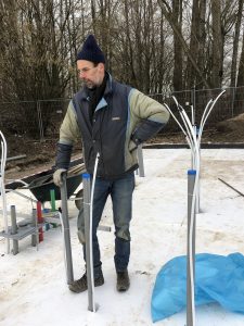 De maand maart even bouwpauze, maar wel het stappenplan gemaakt voor de opbouwfase: de muren, het dak. Ook de installatiekosten en de installatie zelf vroegen veel aandacht. Ondertussen kwamen we in contact met een ervaren bouwer met onze bijzondere bouwwijze, de heer Pradiep. Begin april liepen we stage op zijn bouwplaats in Enschede. Inmiddels zijn al de nodige apparatuur en materialen aangesleept: compressor, zware boormachine, vloerpinnen, laserapparatuur en dergelijke.
