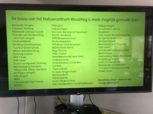 Op bovenstaande foto het enorme aantal sponsoren, geldverstrekkers, materiaalleveranciers enzovoort, die de realisatie van ons prachtige Natuurcentrum Weusthag mogelijk heeft gemaakt. Allemaal bedankt, allemaal fantastisch… maar hier vooral ook de namen van de vele helpers, die vele helpende handen, of het nu eenmalig was of veel, heel veel keren: Hans W., Rewert, Frans, Wim, Harry, Aloys, Harrie, Wijnand, Jeroen L., Mirthe, Lorette, Jeroen K., Thijs, Eddy, Anna, Gemmy, Marjo, Kerstin, Ibrahim, Alaa, Emad, Bashar, Frederique, Ineke, Gerrit, Loes, Susan, Laurens, Hans L., Henk, Anton, Klaus, Herman en hopelijk ben ik niemand vergeten…