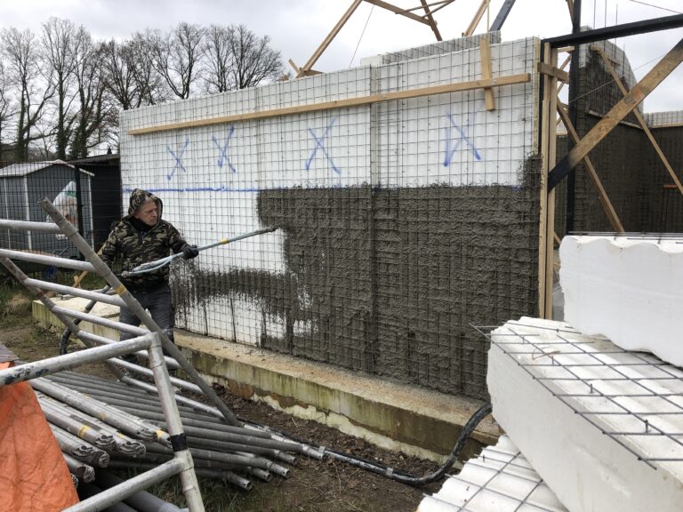 Het is 21 februari. Inmiddels staan alle dragende buiten- en binnenwanden stabiel en zeker. Met het aanbrengen van de infra (water, elektriciteit, riool enzo) beginnen we binnenkort. Daarna kan de eerste cementspuitlaag op de wanden.