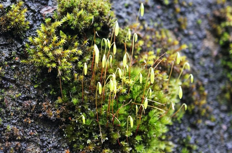 Mossen groeien namelijk niet alleen op de grond of op een boom, maar ook op daken of muurtjes. Op zo’n muurtje groeit bij voorbeeld gedraaid knikmos wat mooie kussentjes vormt. De blaadjes hebben een lange spits, een soort glashaar die het zonlicht weerkaatst en het mos beschermt tegen uitdroging. Het mos vormt een kapselsteel en aan het eind hangt een (naar beneden geknikt) groen langwerpig sporendoosje waar de sporen in gevormd worden. Wanneer de sporen rijp zijn gaat het dekseltje eraf en kunnen de sporen met de wind mee, op zoek naar een mooi plekje om daar weer een nieuw mosplantje te laten groeien. Zo zijn er nog meer mossen die graag op het muurtje willen groeien zoals gewoon muisjesmos en wat denk je van gewoon achterlichtmos!