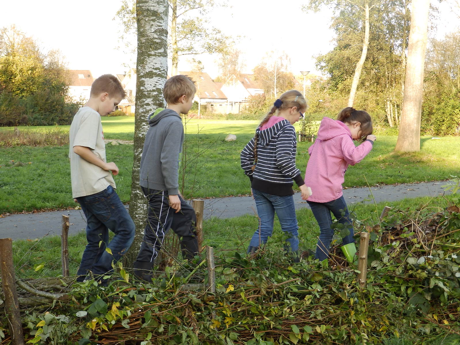 Tijdens NLdoet is verder gegaan met het maken van speelnatuur aan de overkant van ‘t Struunhuus, achter het fietspad en aan het ven. Er zijn stammetjes geplaatst om over te lopen en op te zitten, twee wilgentenen hutten zijn gebouwd en allerlei stammen en stammetjes zijn zo geplaatst om op en mee te spelen. In de loop van het jaar zijn er paadjes door het gras gemaaid. Tijdens de Natuurwerkdag zijn we begonnen met de verbinding tussen ’t Struunhuus en kinderboerderij De Beestenbult en naast de kinderboerderij.