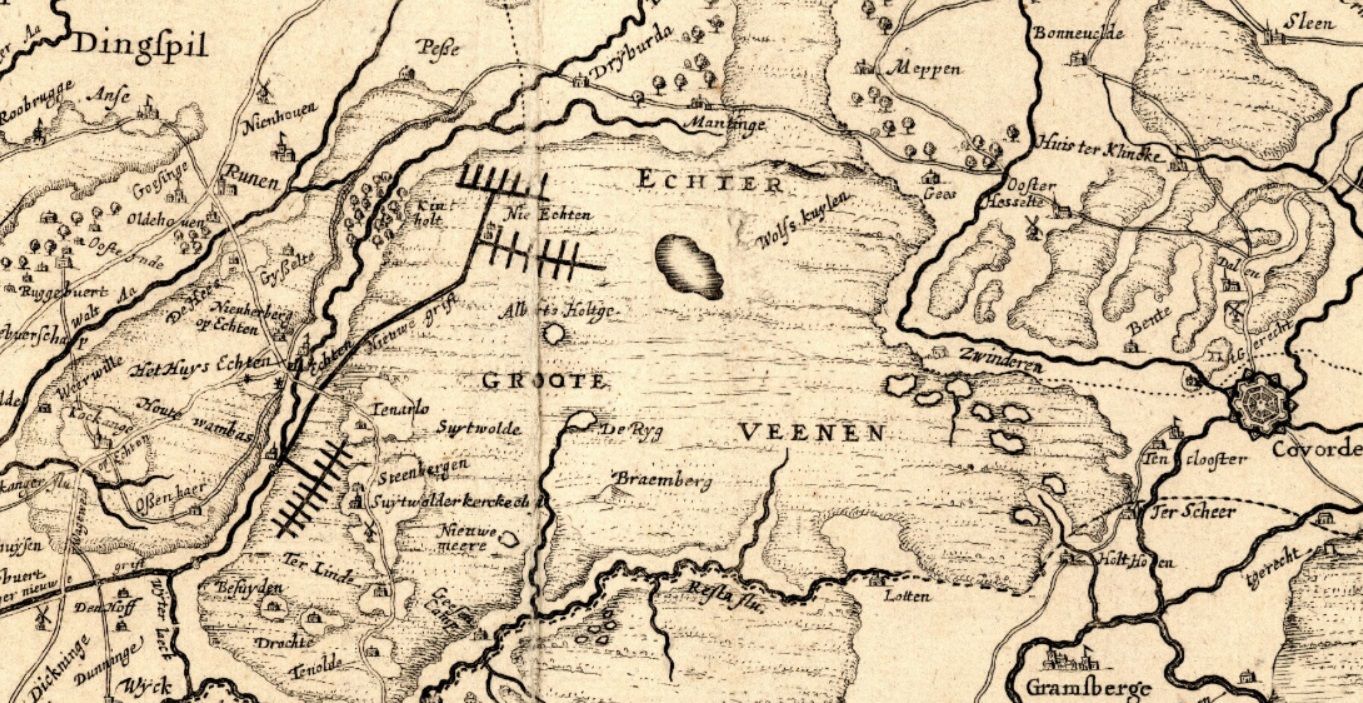 In de omgeving van Hoogeveen vond vanaf 1626 vervening plaats, tussen 1850 en 1900 werd er veel bos aangeplant, van 1930 tot 1950 is men begonnen met ontginnen van gebieden, tussen 1950 en 1960 vond kanalisering en ruilverkaveling plaats en tussen 1945 en 2020 is Hoogeveen pas echt verstedelijkt. Dit werd duidelijk gemaakt aan de hand van kaarten van het Drents Archief, zoals de kaart bij deze post uit 1634. Hierop is het hedendaagse Hoogeveen al wel te zien, maar heette het toen nog ‘Nieuw Echten’ in het gebied, Echter Groote Veenen.