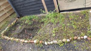 “Vorig jaar hebben we eindelijk ons kunstgras eruit getrokken en ben ik aan de gang gegaan. Ik heb een poel gegraven van 1,5 meter lang, 1 meter breed en op het diepste punt 60 cm diep. Ik heb er een klein natuurlijk tuintje omheen gemaakt waar ik inheemse bloemzaden heb gestrooid. Van de buren heb ik keien gekregen en een kruiwagen vol splitstenen voor een paadje. En de rest van de tuin heb ik aangevuld met fruitstruiken en kruiden. De appelboom hadden we al een paar jaar staan, dus die mocht blijven. Ik heb hooguit €20 uitgegeven aan een aantal insectenhuisjes. De fruitstruiken komen van weggeefacties. Het duurde even voor alles op gang kwam, dus op het eerste oog ziet het er niet uit. Maar gaandeweg kregen we steeds meer bloemen rondom de Tuiny poel: goudsbloem, bolderik, korenbloem, valse kamille en Franse silene kleuren het kleine stukje rondom het water. Een prachtig gezicht wanneer de bijen, vlinders en kevertjes de tuin weten te vinden.”