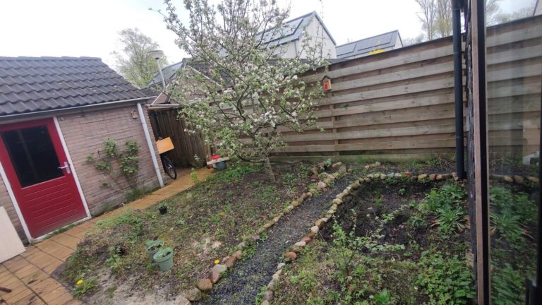 Judith is vorig jaar begonnen met haar natuurlijke pluktuin, midden in Hoogeveen. “Wij hebben helaas die geldboom ook nog niet gevonden, dus het idee dat duurzaam en natuur inclusief tuinieren duur moet zijn, houd ik ook niet van. Ook wij vallen onder de groep die nét boven het minimuminkomen leeft en dat komt met de noodzakelijke keuzes. Dus ik ben gaan bekijken hoe ik het tóch kan waar maken. En zo is het idee voor een natuurlijke pluktuin ontstaan. Gewoon, in een rijtjeshuis.”
