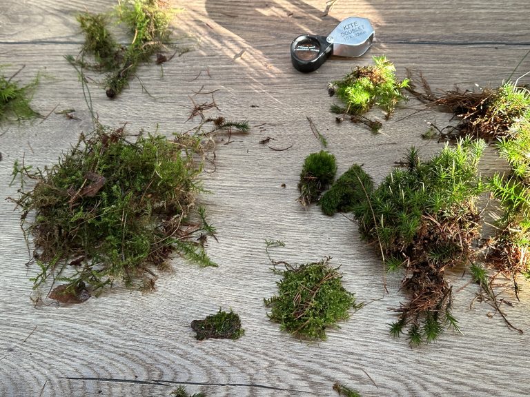Het afgelopen jaar hebben we in 9 theorielessen en excursies een klein beetje kunnen leren over de Natuur. Zo veelzijdig als de Natuur is, daar kom je dan weer achter. Ook als cursusteam blijven we ons verbazen. 9 lessen waarbij gemiddeld 15 cursisten aanwezig waren. Zeker als je een jaar rond een cursus in thema’s maakt dan zijn er altijd veranderende persoonlijke omstandigheden waardoor cursisten soms moesten afhaken, maar er kwamen lopende het jaar ook weer nieuwe cursisten bij en dat maakt het ook weer interessant. Alle lessen waren ook afzonderlijk te volgen en daar werd ook gebruik van gemaakt. Alle lessen waren bedacht om de Natuur dichtbij beter te leren kennen. Doordat we met thema’s werkten, en basislessen aanboden was het daarna in het veld vaak een succes omdat sommige soorten beter en sneller werden herkend. Of het nu ging om vogels, planten, vlinders of bomen, het is altijd fijn om zelf al snel iets te kunnen benoemen. Als cursusteam hebben we geprobeerd een zo breed mogelijk scala aan onderwerpen aan te bieden. Op zaterdag 20 januari hebben we deze cursus afgesloten met een workshop Mossen in het IVN-studiecentrum de Veldhoeve in Orvelte. Het was een volle zaal belangstellenden die, nadat mossenkenner Hans Colpa eerst een presentatie hield, naar buiten ging om mossen te zoeken. Daarna werden ze met een loep bekeken en op naam gebracht.